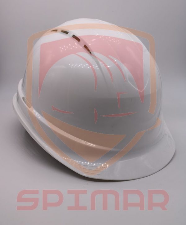 Casque chantier en polyéthylène avec bande anti-transpiration et molette de réglage.